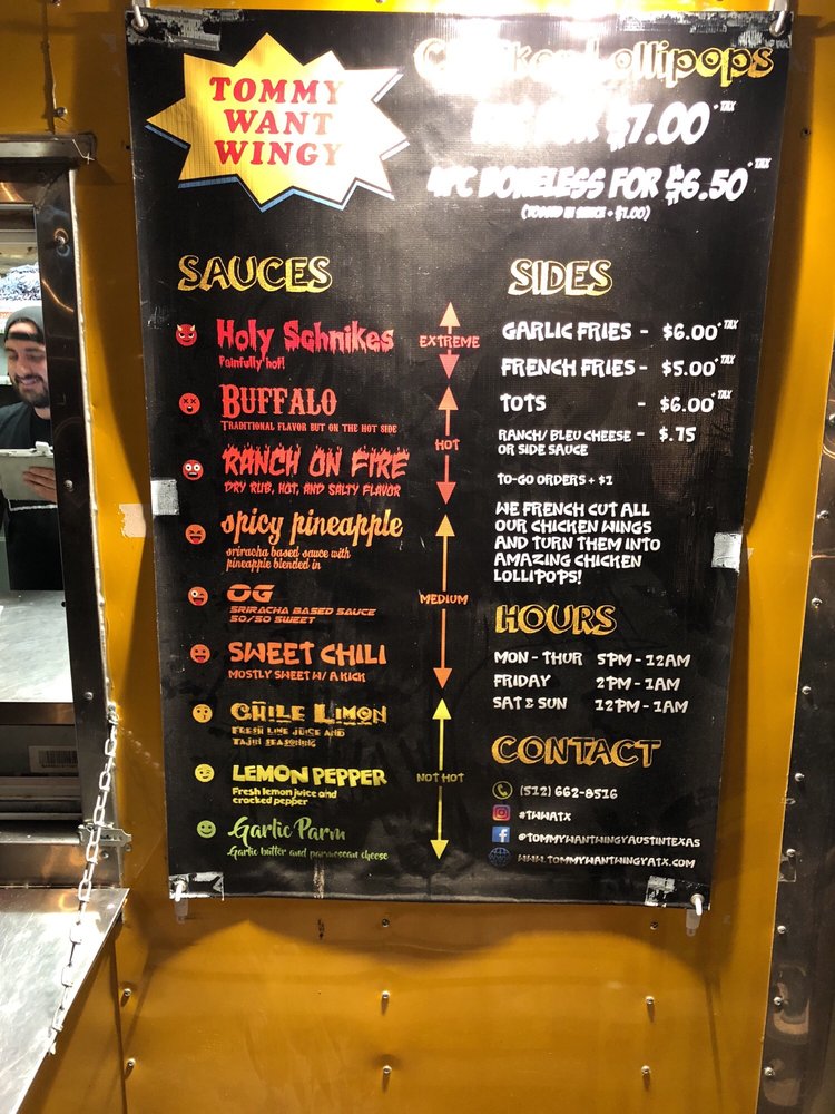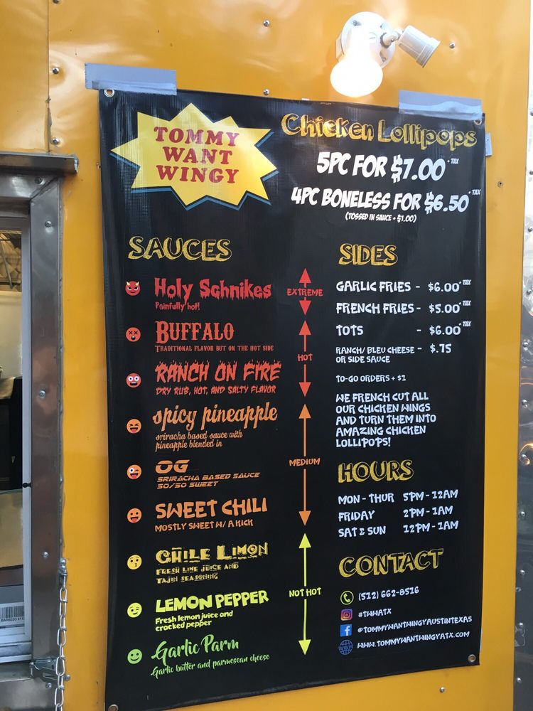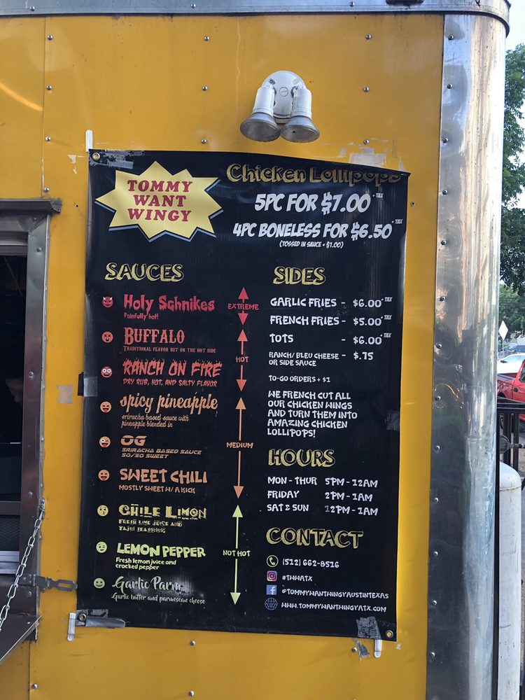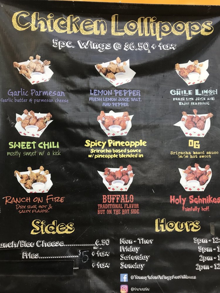 "Tommy Want Wingy" is a food truck in Austin, TX, known for its delicious and innovative wings. Customers rave about the crispy skin, moist chicken, and flavorful sauces. The unique French cut lollipop wings have garnered high praise for their size, flavor, and crunchiness. The menu offers a variety of wing shapes and flavor profiles, including honey sriracha, sweet chili, and lemon pepper. The wings are described as a "thing of beauty" and are worth the price for their quality. The food truck also offers vegetarian options and has convenient amenities such as takeout, reservations, and outdoor seating. Overall, "Tommy Want Wingy" is a must-visit for wing lovers looking for a unique and tasty experience.